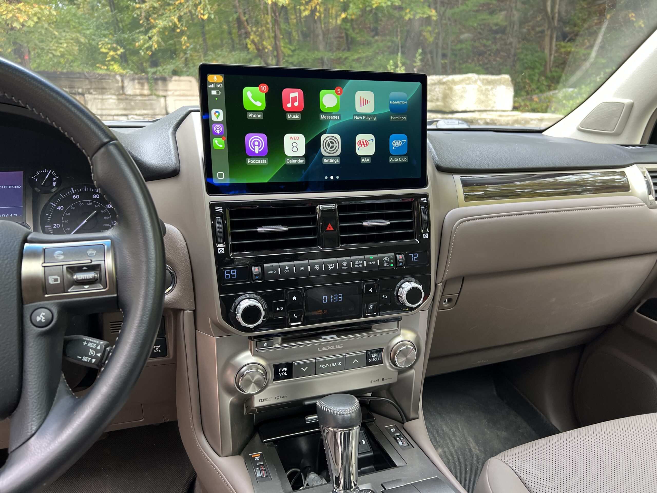 Instead of just being a plug-in CarPlay dongle or even simple screen swap, Hamilton’s Conversion kit is a full center stack replacement for the pre interior-refresh GX460. It comes as one unit that you swap in for the components above the OEM CD player (which stays), and it has a 12-inch screen just like the post-refresh 460. The system has wired and wireless CarPlay and Android Auto, and critically it preserves all factory functions. That means the original microphone, steering wheel controls, backup camera, and factory software are as usable as they are in a stock rig. And most importantly: Real buttons and knobs!
