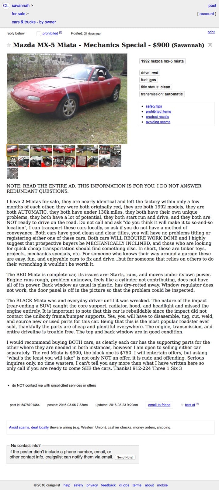 There were a bunch of wonderfully-modded Miatas unearthed last week, and some like the Flyin’ Miata FMIII found by Engineerd had stratospheric price tags to go along with the work. The winner however was this pair of Miatas (Miati?) that have been modded by a lack of proper maintenance on one, and apparently a truck into the other one’s rear end. Those mods bring the price for the pair down to the point where they could be the basis for your own modded Miata, and how awesome does that sound? Congrats to Sean McMillan for the find, and thank you all for playing. By the way, when was the last time anybody won anything with just a pair?