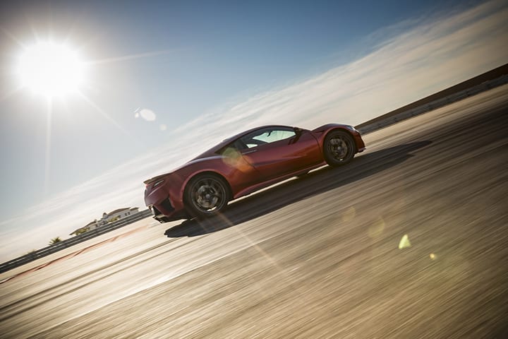 This is definitely not a track special, but I found it more than at home pounding around Thermal’s 1.8 mile road course. With Track Mode selected the drivetrain and chassis get serious and the stability control allows the driver more a longer leash (stability control is fully defeatable if you desire, thank goodness). At moderate pace the balance is highly adjustable, but overcharge corner entry and the 3800-lb curb weight makes itself evident as the front tires scrub off speed. Once the car takes a set in the corner you can get back to power ridiculously early and feel the torque vectoring help rotate the car and drive you out of the corner. Mat the throttle early and rear end swings wide in an easily controllable slide. The deceleration on tap from the carbon ceramic brakes and TMU is excellent and easy to modulate despite the brake-by-wire pedal. In manual mode gearshifts lose some of their fluidity and you can bang up against the rev limiter to your heart’s content, but the gearbox works perfectly for track work left to its own devices. With so many gears on offer and such a wide power band the NSX is always ready to fire itself out of a turn and I think most drivers would wind up slower when shifting the gearbox themselves. Track Mode also enables launch control, which feels like it lives up to every bit of Acura’s sub-3 second claim for the 0-60 sprint.