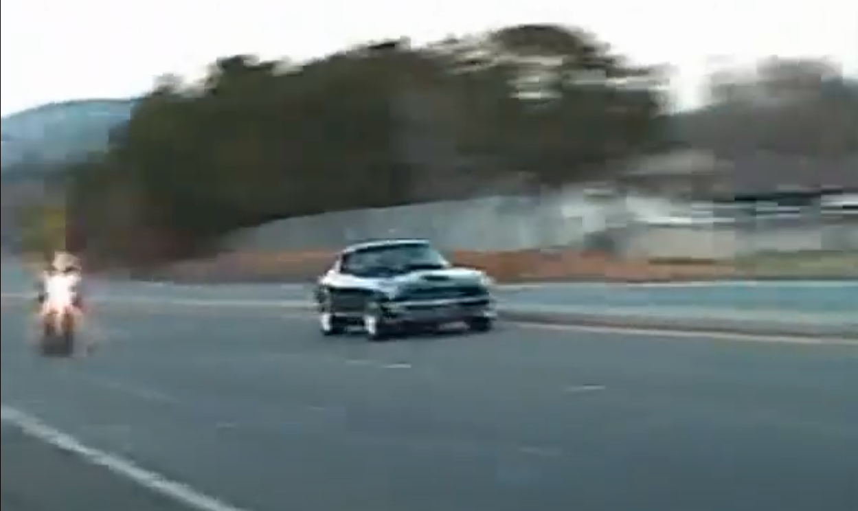 The two vehicles come roaring towards the camera and as they pass the 240Z is ahead of the literbike!