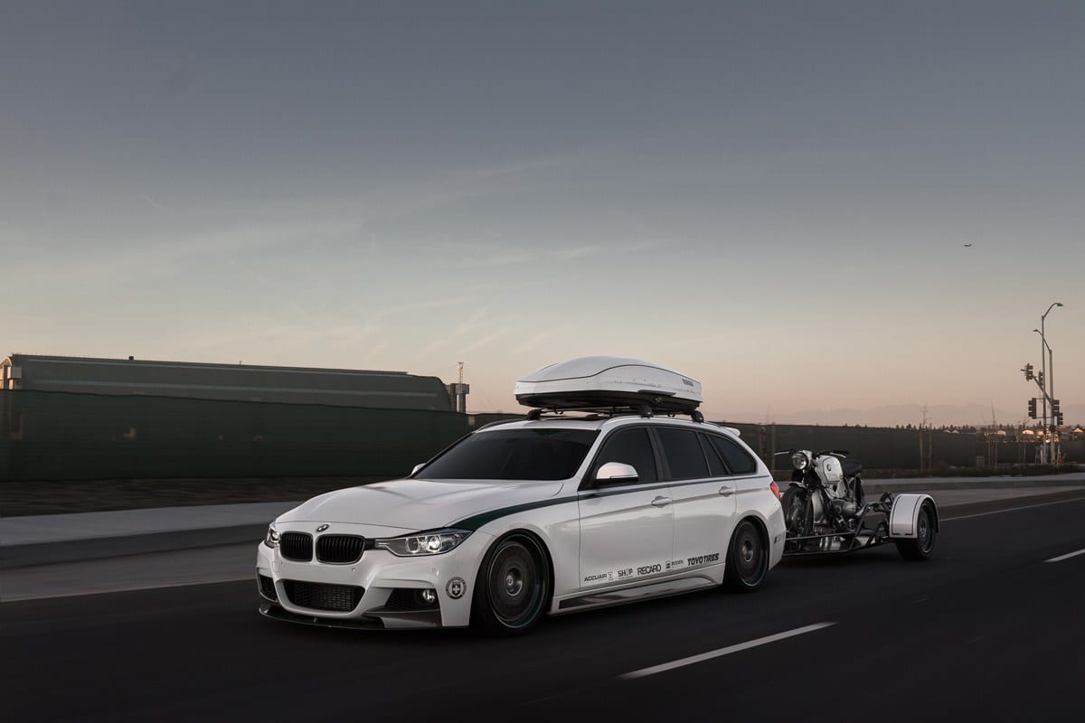One of my personal favorites is a BMW 328ix Touring that had been massively modified. The car, built for Stan Chen, is a 2014 BMW wagon nicknamed Von Doom. This rig wears a ton of M Sport parts, an AccuAir suspension, and some minor performance upgrades. A matching trailer complete with an AccuAir setup of its own was also commissioned and used to tow a 1973 BMW R75.