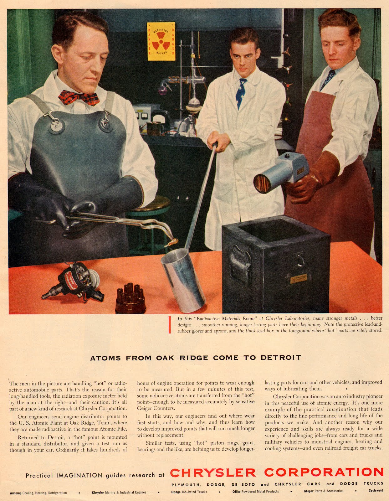 In the 1950s atomic this and radioactive that was all the rage. The atom may be one of the smallest things around, but back then it was pretty big, especially when some crazy scientist decided to split one. Chrysler, always wanting to be the half-life of the party, offered this ad where three soon to be cancer victims transferred a radioactive set of points to the safety of an open metal cup after running wear tests on it. Fortunately they do have a lead-lined box for longer-term storage. That right there was practical imagination at work.