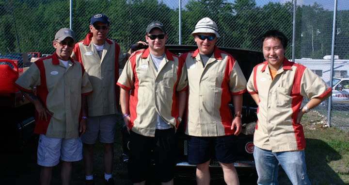 Without further ado, here’s Team Trailing Throttle Oversteer, resplendent in snazzy rust-and-blood-colored bowling shirts.