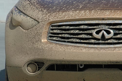 When we wrapped up our rally course conniptions, and were heading back toward the maintained roads of California City, Jeff gingerly piloted the Hurst Camaro back through the scrub, avoiding the massive potholes and sump-cracking rocks as best he could. I took a slightly different path, circling around a large muddy smear in the middle of the road, amazed that the pebbly scrag I was maneuvering over was showing up as a street on the GPS. Tim, not wanting to miss an opportunity to test the Infiniti’s slip control plowed right through the mud, giving the FX a nice camo effect.