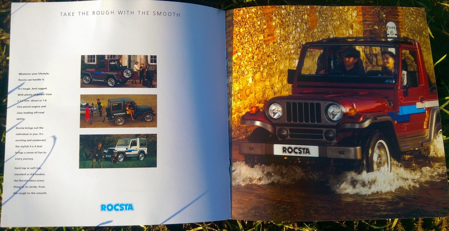 “Built to take on the toughest terrain, the Rocsta commercial is a rugged, durable and amazingly reliable 4×4” I have never, ever seen one of these commercial variants on the road, and wonder what small business would see the Rocsta as a sensible choice. I can understand farmers wanting a cheap, field-capable machine of reasonable civility for all-weather cross-country rapid-response duties, but they would also have had the Suzuki SJ413 and Daihatsu Fourtrak to choose from. Mind you, this brochure is so slim and vague it doesn’t actually go into detail as to what determines the differenced between the Standard, DX and Commercial models. It does show a hardtop as well as a convertible being offered; oddly the commercials all appear to have soft-tops.
