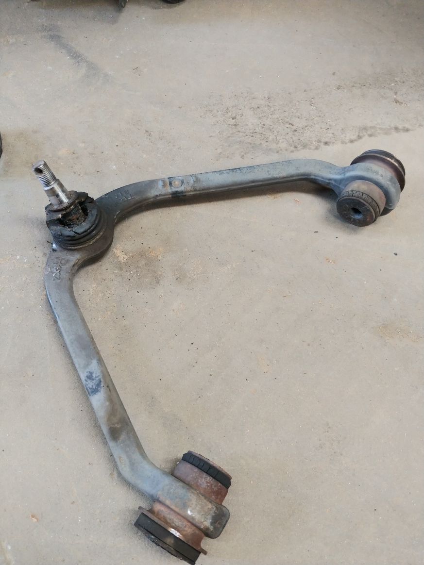 We jacked up a front corner and I jiggled the wheel as he looked underneath. He immediately knew it was the upper control arms and idler arm. I knew it was pretty far gone when he had us take his truck to go get parts lol. This was the status of my upper control arms. Pretty sure that the ball joint isn’t supposed to be like this. Unsurprisingly, the truck is much easier to keep straight now.