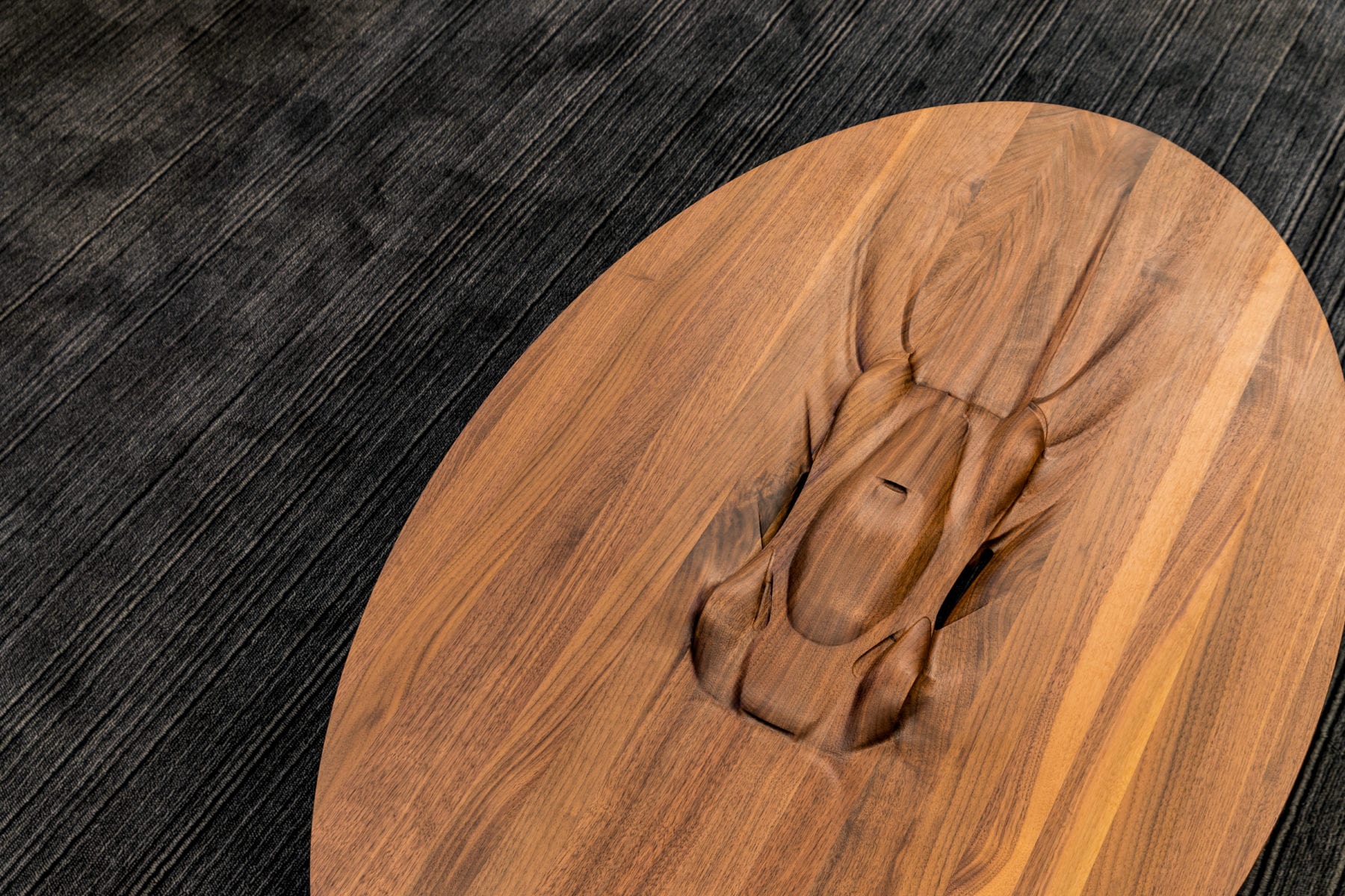 What makes this one so expensive? This one is handcrafted from solid walnut while the legs are machine aerospace-grade aluminum. It’s four feet long and four inches thick. And in the middle is that admittedly cool Aston Martin Valkyrie bit of art. It’s called the Wake coffee table, because the car appears to be ripping through the air creating a wake behind it.