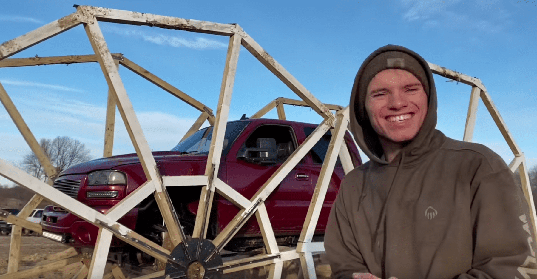 The truck in the video above is fitted with twenty-foot wheels. The host of the channel references being impressed years back when Bigfoot rolled out on 10-foot wheels. This is doubly cool. But it’s also wild, because the wheels here are made mostly from wood. And 70-pounds of lag bolts. Oh, and all the steel for bracketing and bolting this monster hoops to the widened hubs.