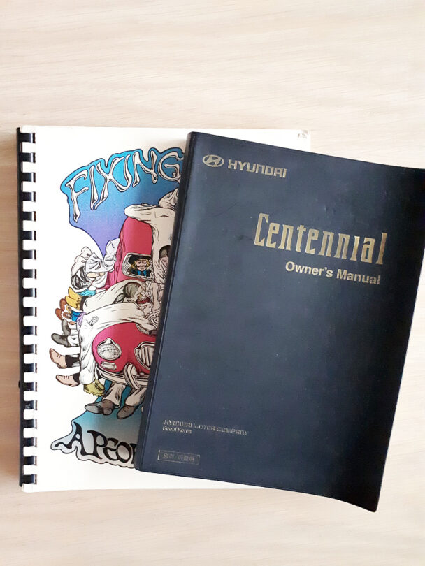 Summer vacation is well underway here. Lovely, lazy days for everyone, except I run back and forth painting and fixing house stuff. A lovely surprise then to receive not one, but two packages I had been looking forward to today. The Centennial’s former owner finally send my the manual (English from one side, Arabic from the other), and a good man in San Francisco send me Fixing Cars, the People’s Primer. Have had a quick look at both, perfect! Thanks @Batshitbox!