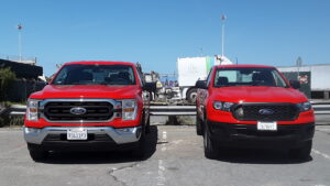 This should be a comparo of the 2023 mid-size Ford Ranger (there’s no ‘compact’ so what’s it in the middle of ?!?) and the full size F-150
